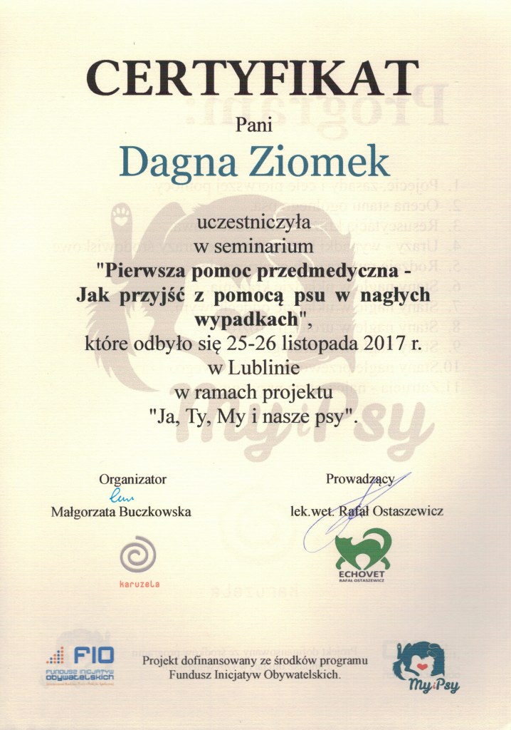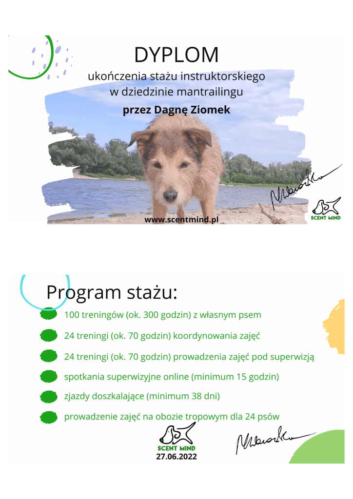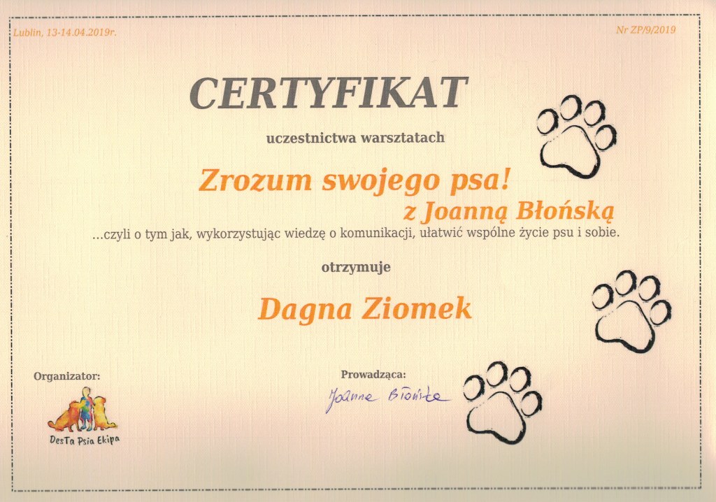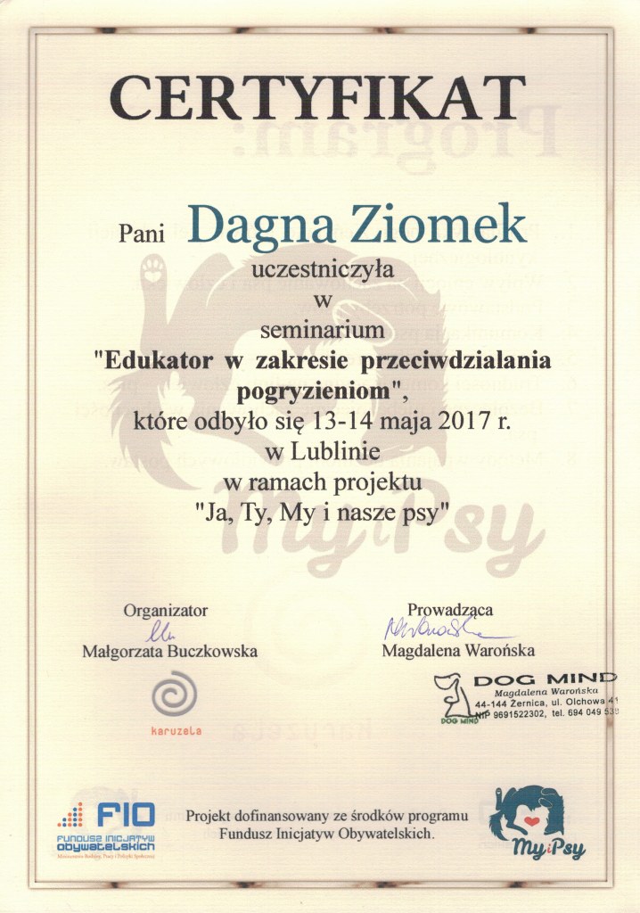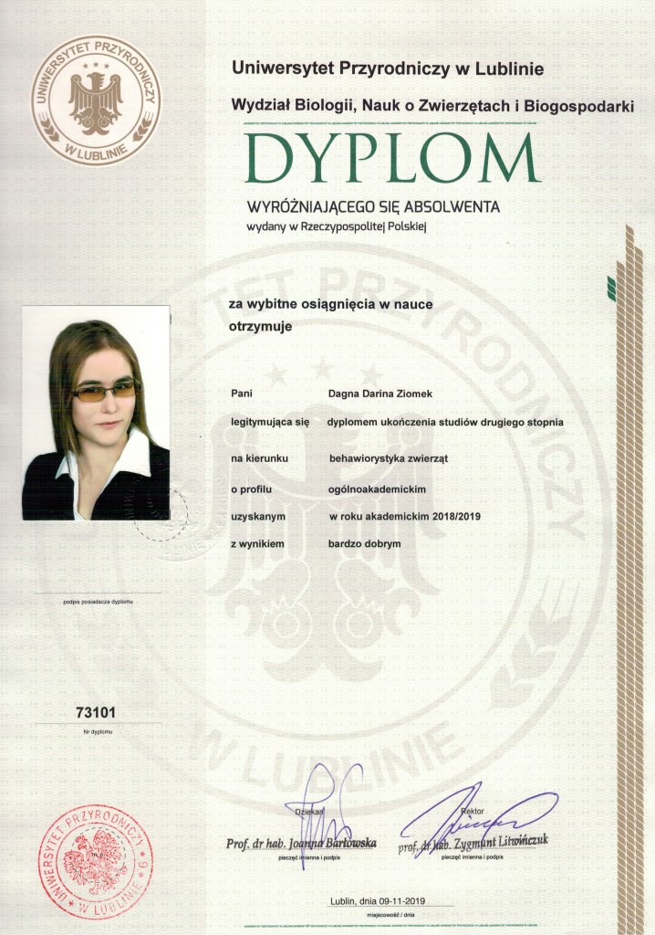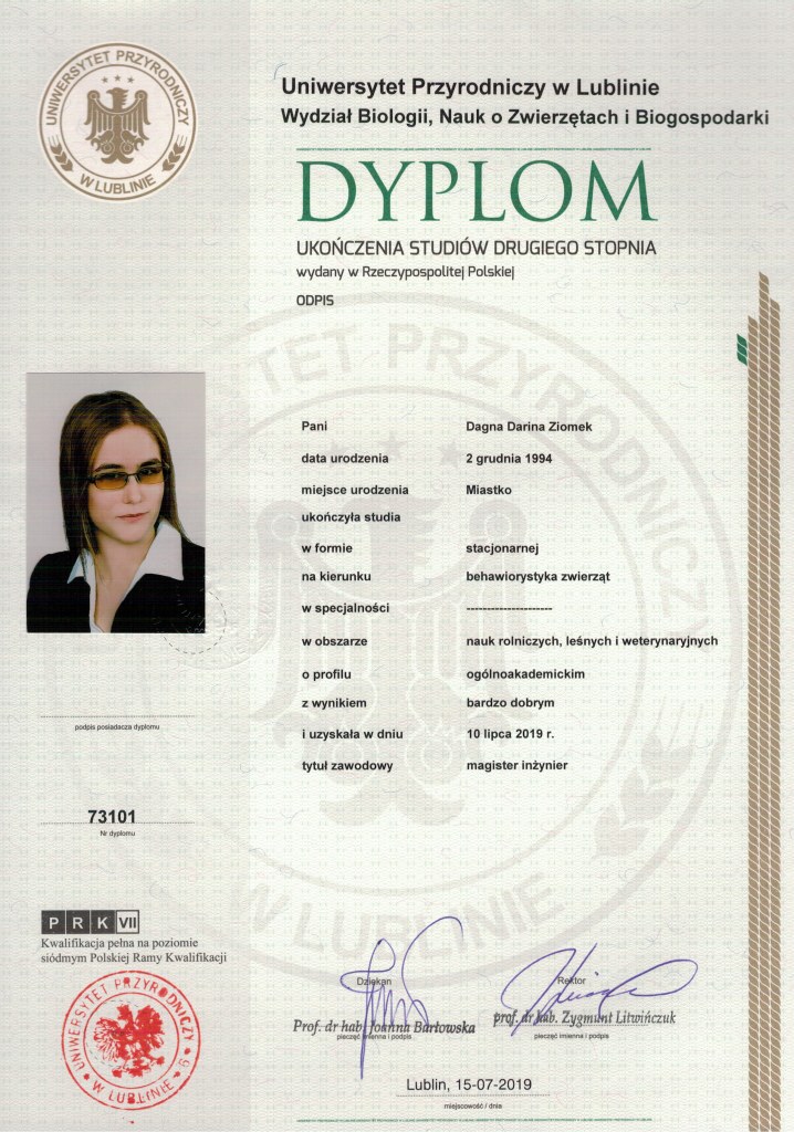 Nazywam się Dagna Ziomek, z wykształcenia jestem behawiorystą i geodetą – po technikum geodezyjnym ukończyłam studia inżynierskie i magisterskie na kierunku „behawiorystyka zwierząt” na Uniwersytecie Przyrodniczym w Lublinie, w międzyczasie zdobywając tytuł inżyniera na kierunku „geodezja i kartografia” oraz studiując „pielęgnację zwierząt i animaloterapię” na tej samej uczelni.