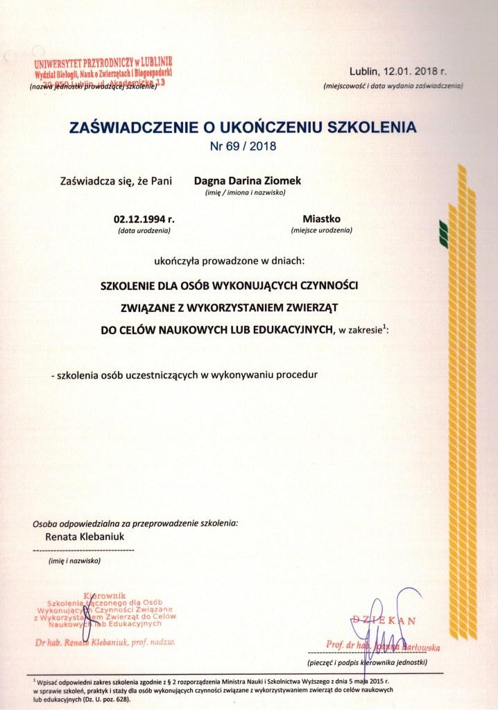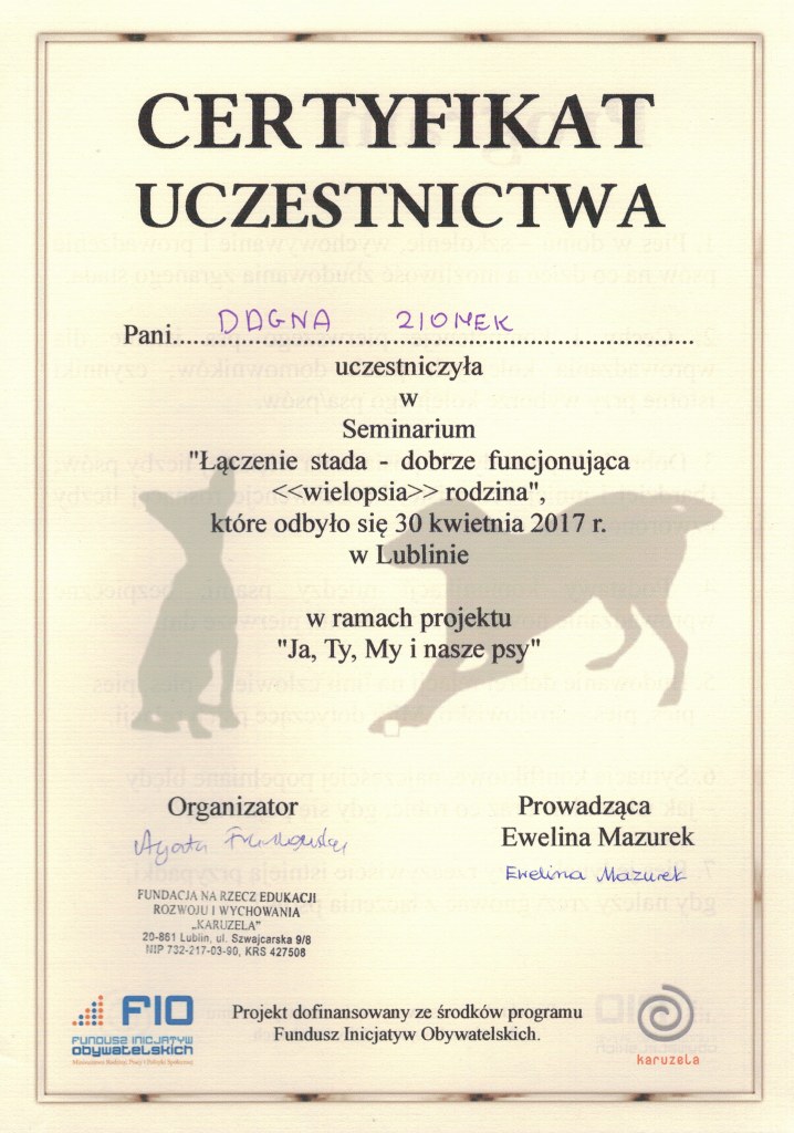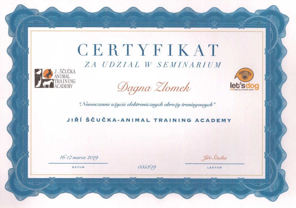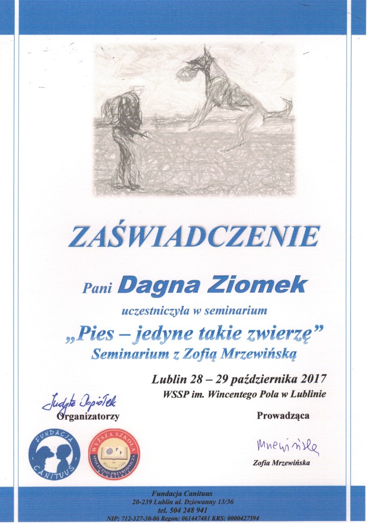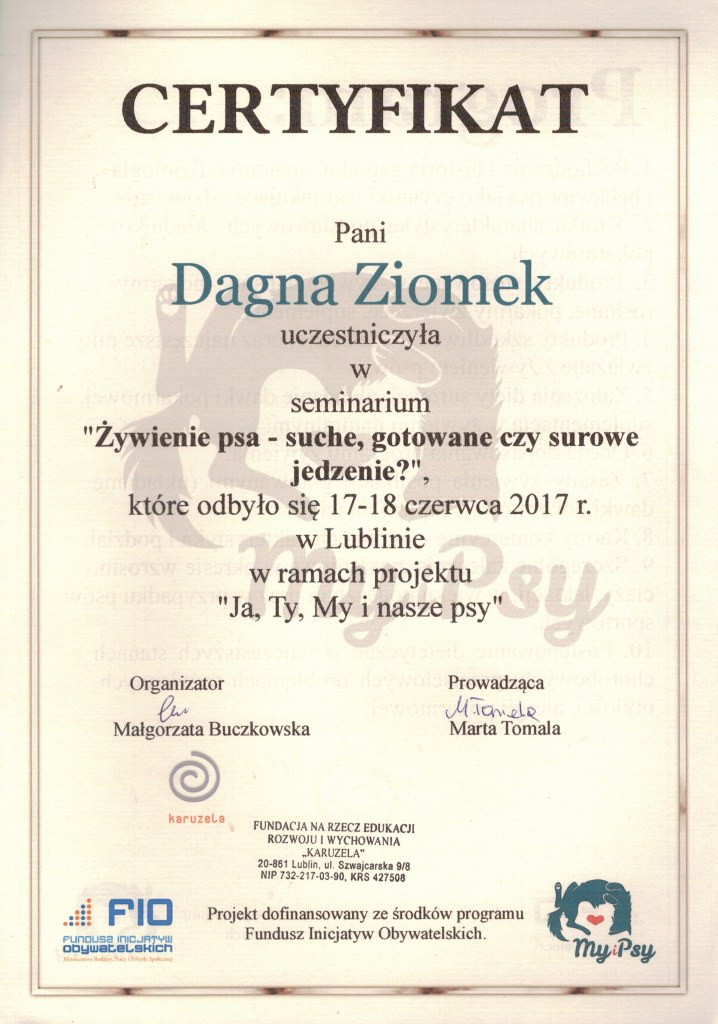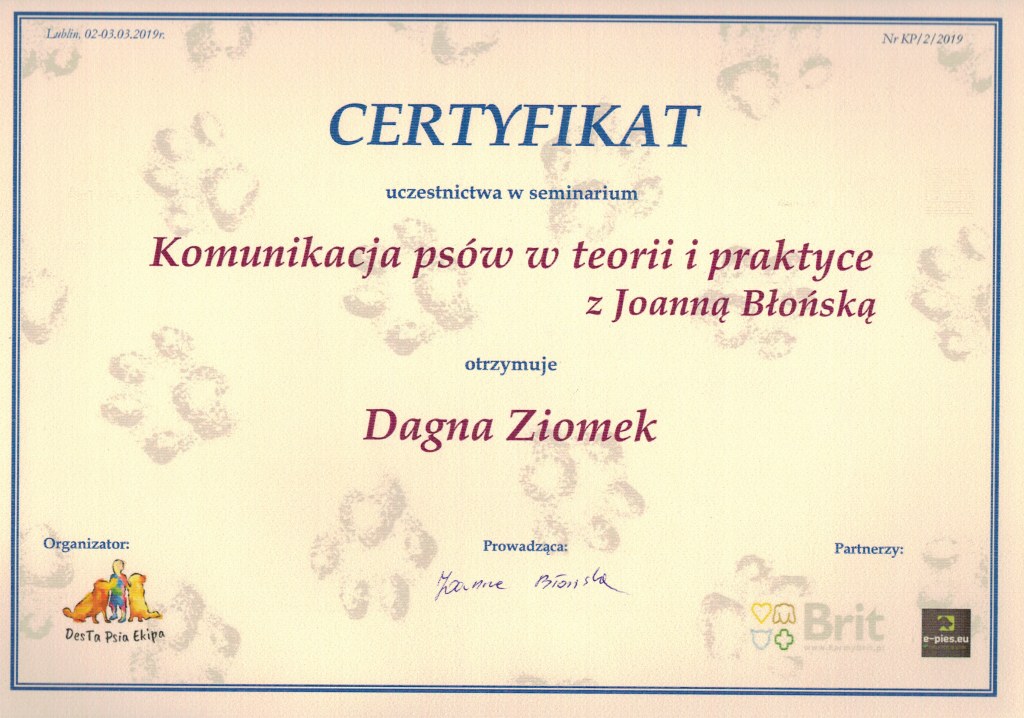 Nazywam się Dagna Ziomek, z wykształcenia jestem behawiorystą i geodetą – po technikum geodezyjnym ukończyłam studia inżynierskie i magisterskie na kierunku „behawiorystyka zwierząt” na Uniwersytecie Przyrodniczym w Lublinie, w międzyczasie zdobywając tytuł inżyniera na kierunku „geodezja i kartografia” oraz studiując „pielęgnację zwierząt i animaloterapię” na tej samej uczelni.