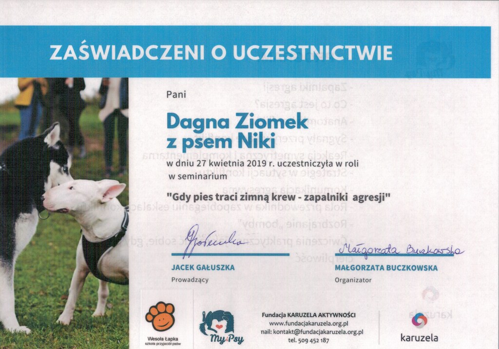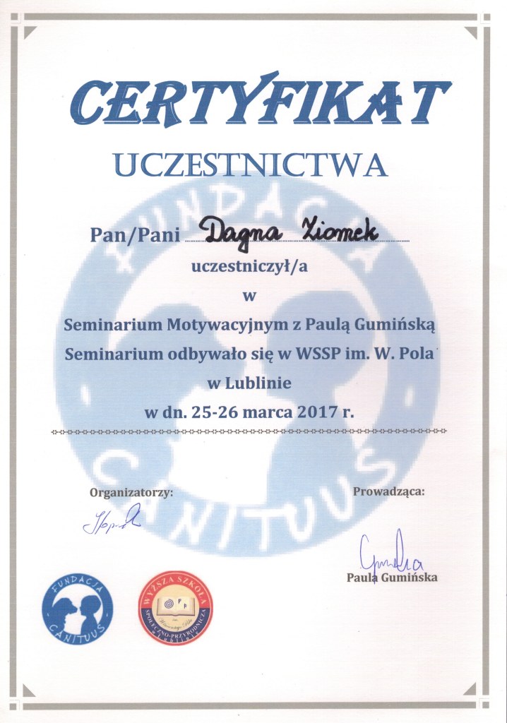 Uczestniczyłam również w wielu seminariach i webinarach o szerokim zakresie tematycznym – do moich ulubionych tematów należy komunikacja i agresja.