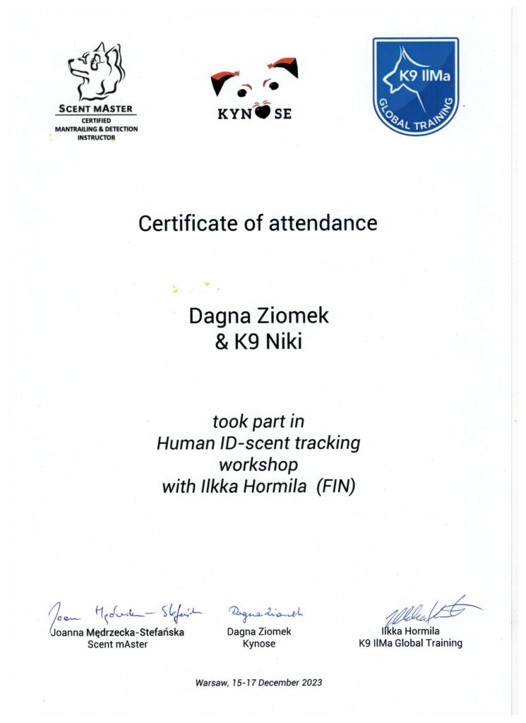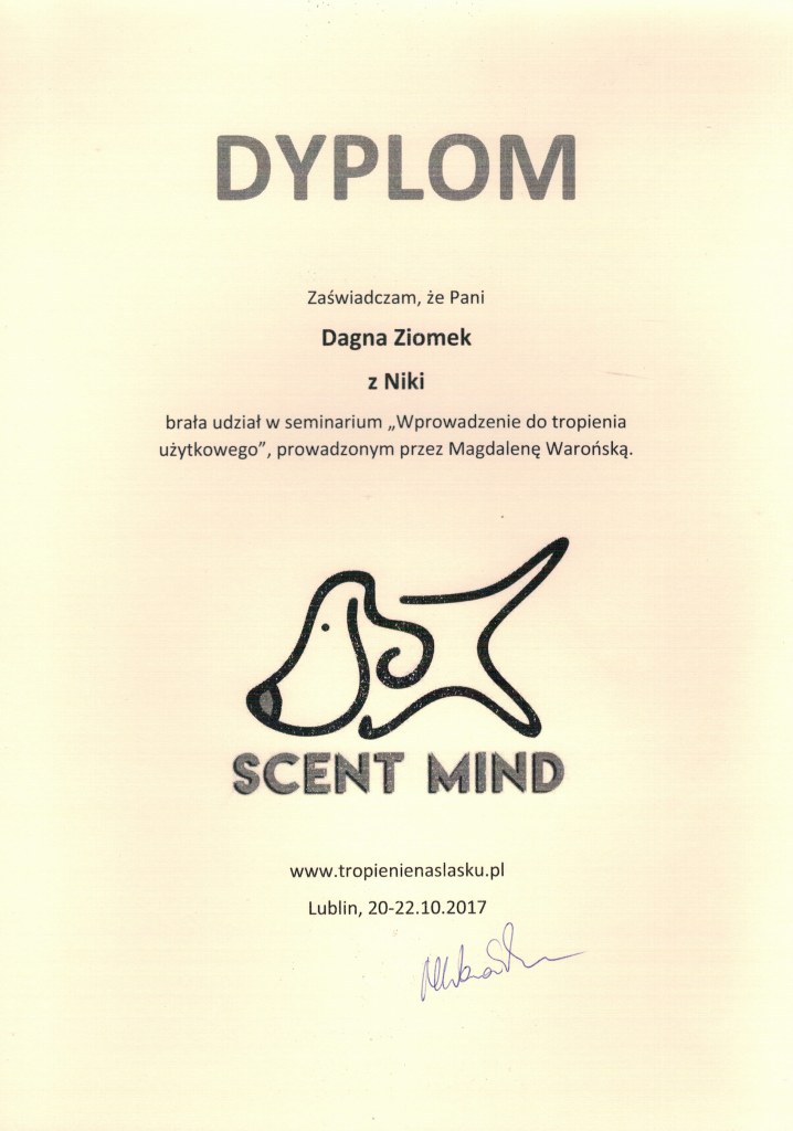 Na jednym z seminariów wraz z Nikim odkryliśmy nasze wspólne hobby, jakim jest tropienie użytkowe. Tropiliśmy w systemie Master Mind K9 stworzonym przez Scent Mind – szkoła tropienia, grupa tropiąca i Scent mAster – przez rok miałam zaszczyt koordynować pracę lubelskiej grupy i wspólnie się uczyć, co zaowocowało zdanymi egzaminami na poziomie PLMT2 oraz udziałem w kursie instruktorskim prowadzonym przez Scent Mind. Od 2022 roku prowadzę samodzielne zajęcia w Warszawie oraz współprowadzę szkołę tropienia Scent Mind. W międzyczasie razem z Nikim zaliczyliśmy oficjalną próbę PLMT3 oraz zdobyliśmy Brązową Odznakę PLMT2 w 2023 roku. Wzięliśmy też udział w kursie trackingu Hard Surface ID-Tracking prowadzonym przez Ilkkę Hormila i nie zamierzamy przestać się rozwijać w zakresie pracy węchowej 😉