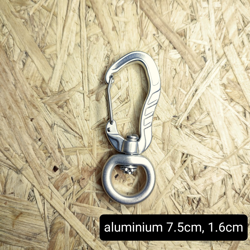 - aluminiowe – bardzo lekkie i bardzo wytrzymałe karabinki o obciążeniu niszczącym wynoszącym aż 400kg. Średnica oka wynosi 1.6cm, jednak dzięki swojej lekkości możliwe jest zastosowanie tych karabinków w każdej z szerokości taśm. Długość karabinka wynosi 7.4-7.5cm. Dostępne w kolorze czarnym i srebrnym