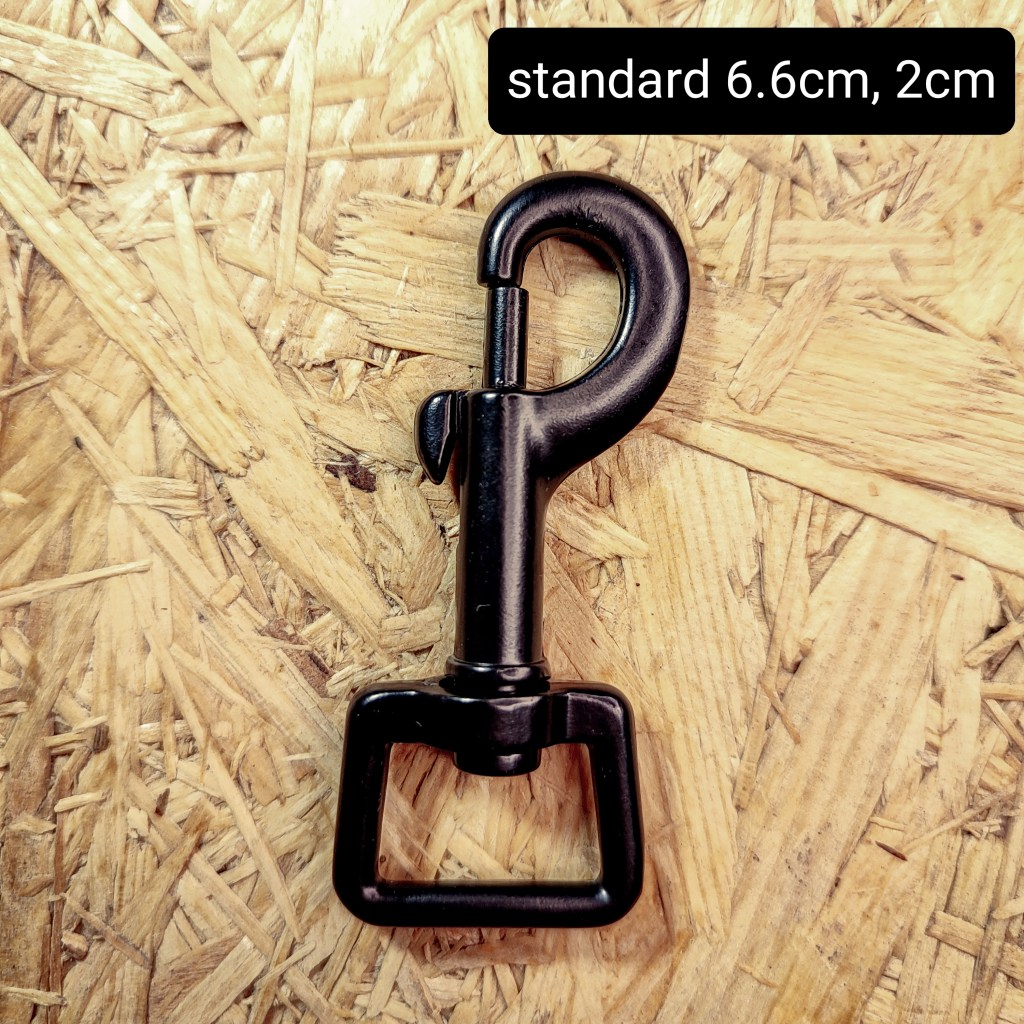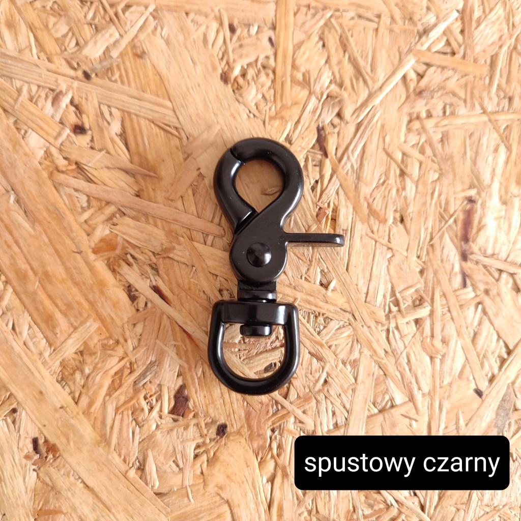 - spustowy czarny – bardzo szybko pozwala się otworzyć. Obciążenie niszczące wynosi 130kg, długość karabinka 6.1cm – dobrze się sprawdza na psach średnio-mniejszych (ok. 40cm wzrostu), nie obija się o łapki