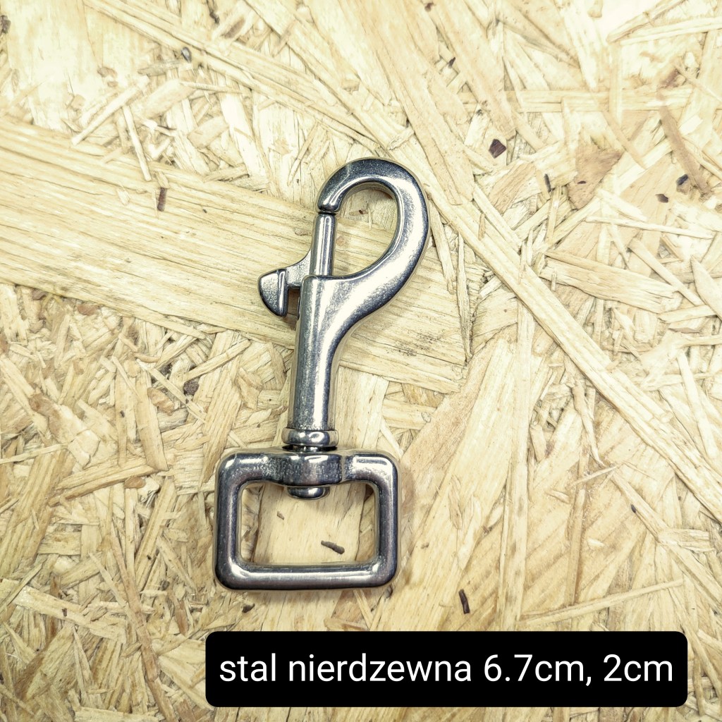 - ze stali nierdzewnej – karabinek tłokowy w kolorze srebrnym, o długości 6.7cm. Ciężki i wytrzymały (obciążenie niszczące wynosi 220kg), odpowiedni do smyczy o szerokości 2cm
