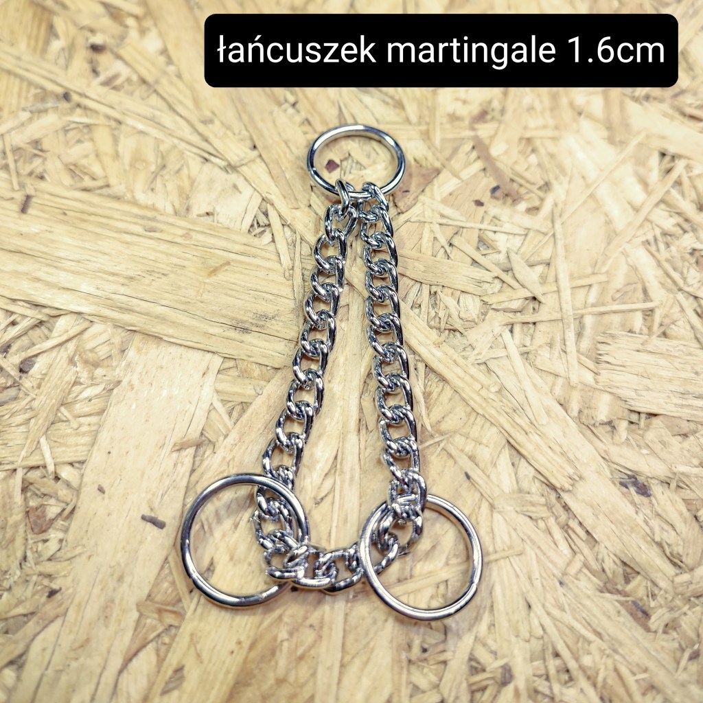 - łańcuszki martingale – rodzaj zapięcia do obroży półzaciskowych. Średnica oczka wynosi 1.6cm, a długość łańcuszka 14cm. Obciążenie niszczące wynosi 120kg